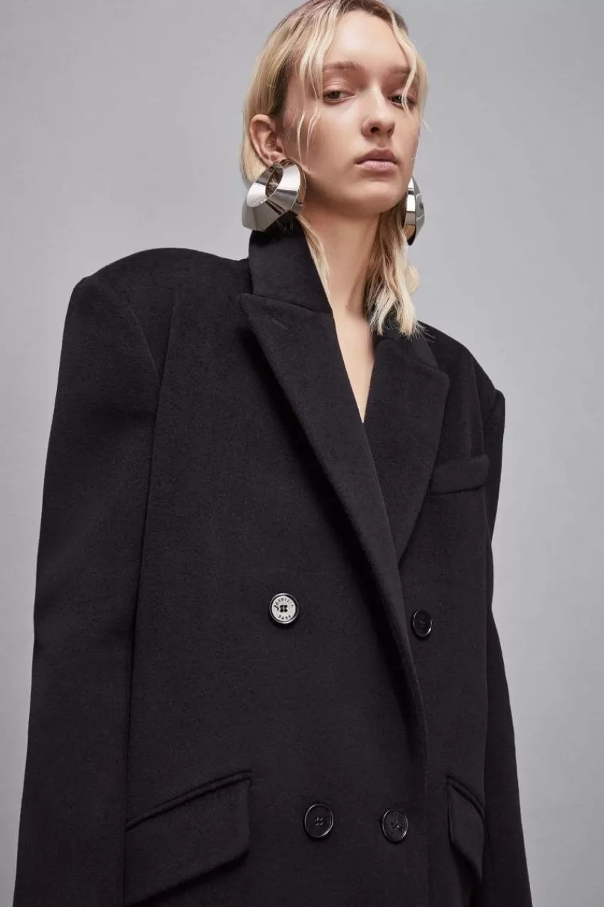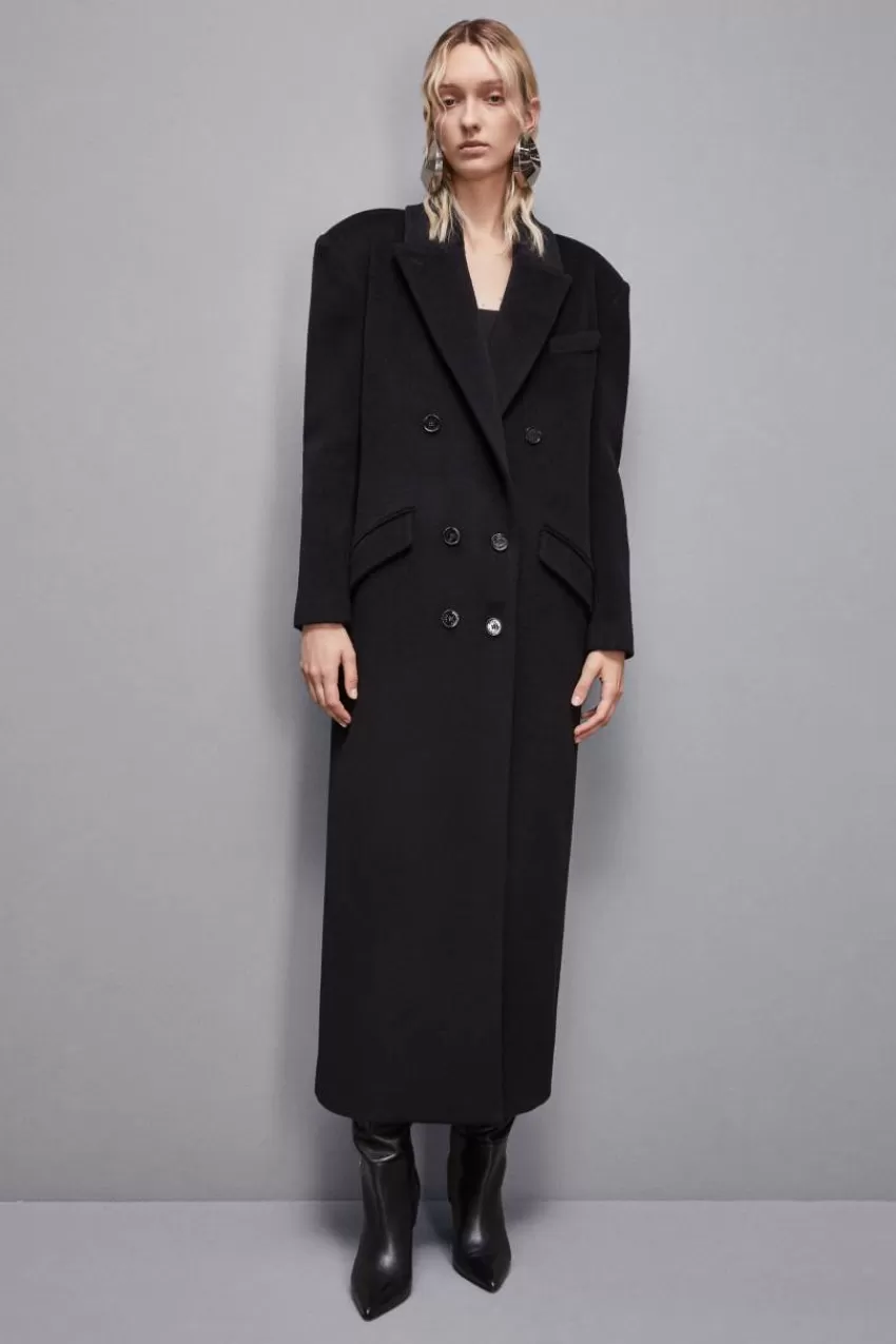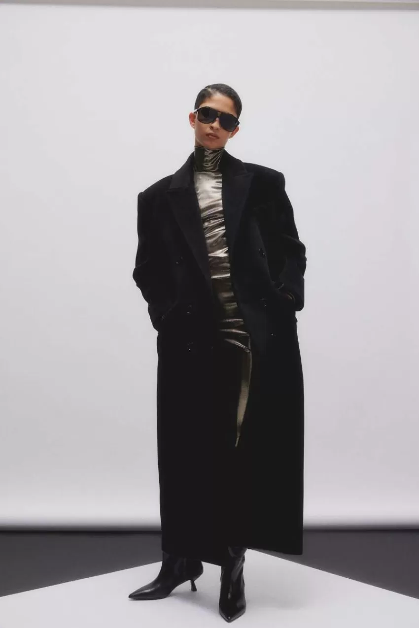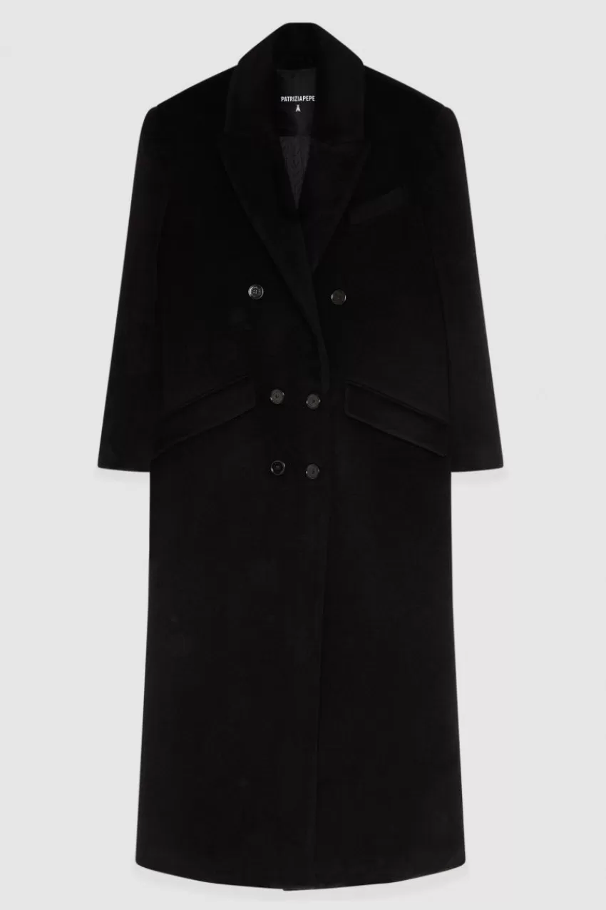 Valorizza con stile i look di questa stagione con il cappotto doppio petto in panno. Lungo alla caviglia, si distingue per le spalle importanti che danno al capo un’allure iper chic.