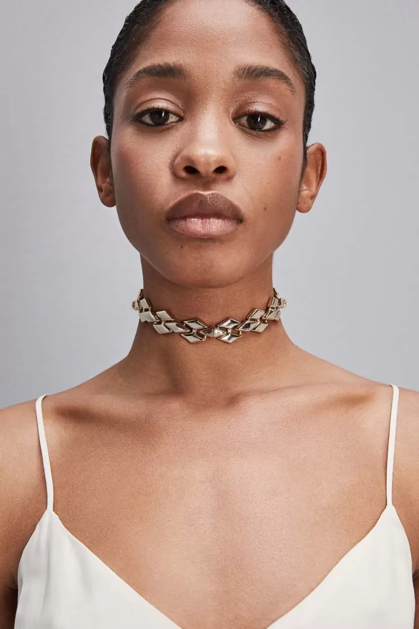 Importante collana girocollo realizzata in lucente ottone, con maglie decorate da un personalizzazione in micro fly che rendono riconoscibile lo stile inconfondibile di Patrizia Pepe. Indossala per distinguerti con un gioiello raffinato alla moda.