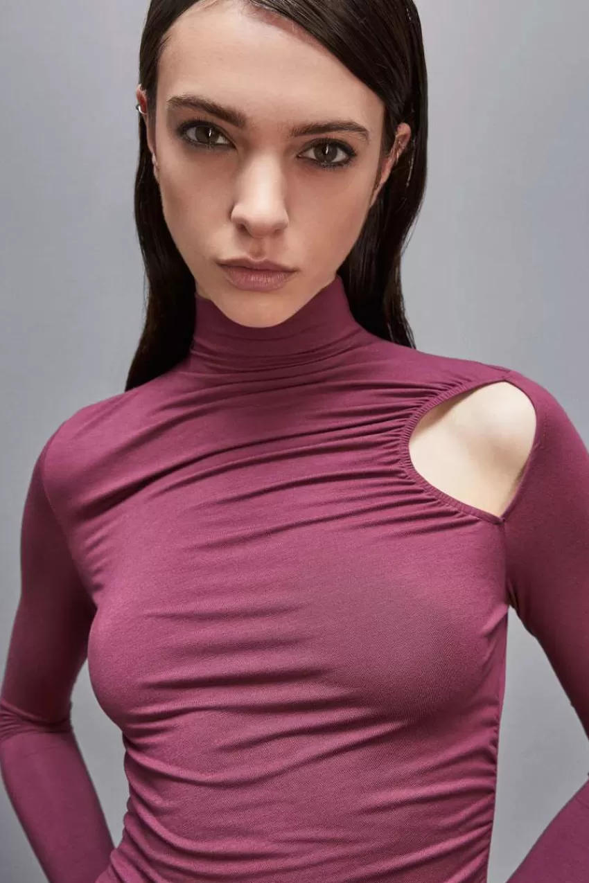 Seducenti drappeggi e mini cut out su spalla per questo abito a collo alto in jersey. Il capo presenta manica lunga e vestibilità slim. Il tocco in più: l’inconfondibile dettaglio Fly.