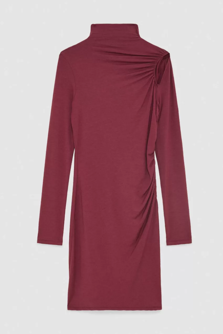 Seducenti drappeggi e mini cut out su spalla per questo abito a collo alto in jersey. Il capo presenta manica lunga e ve…