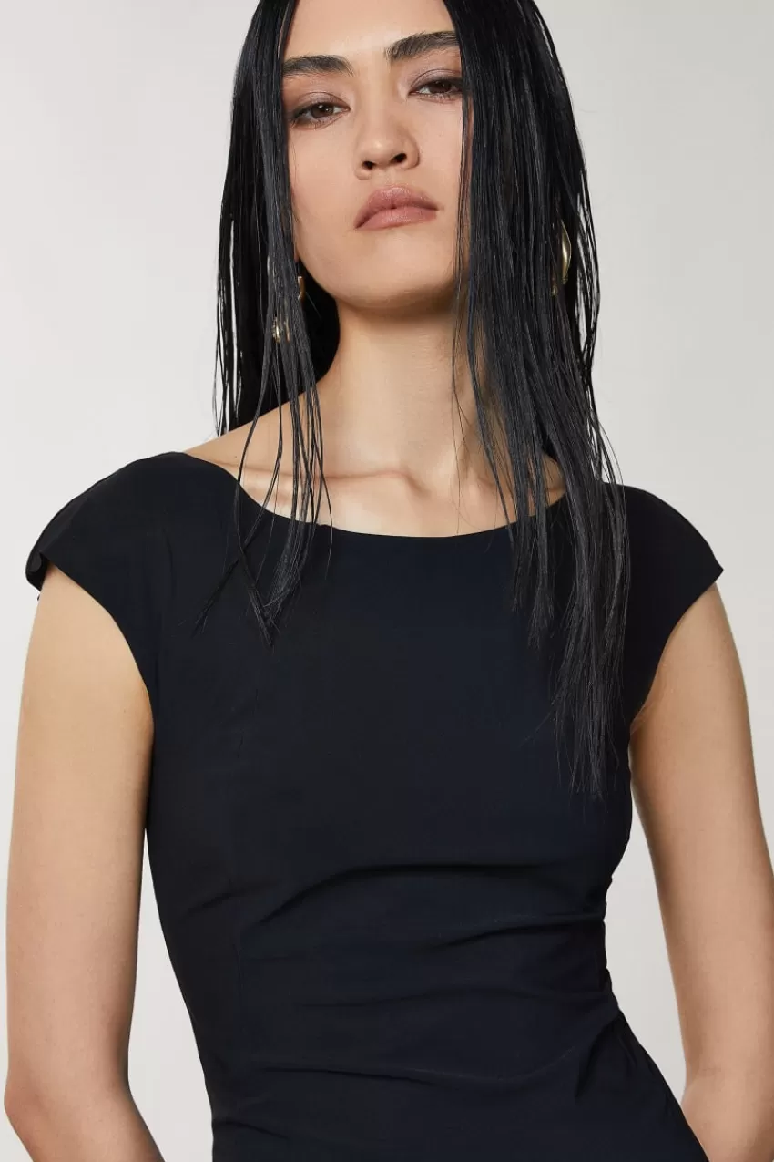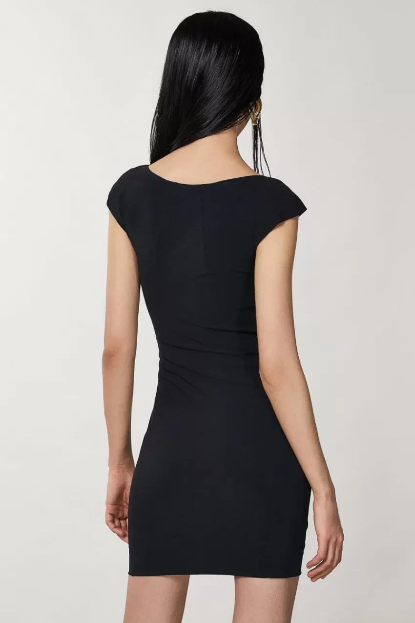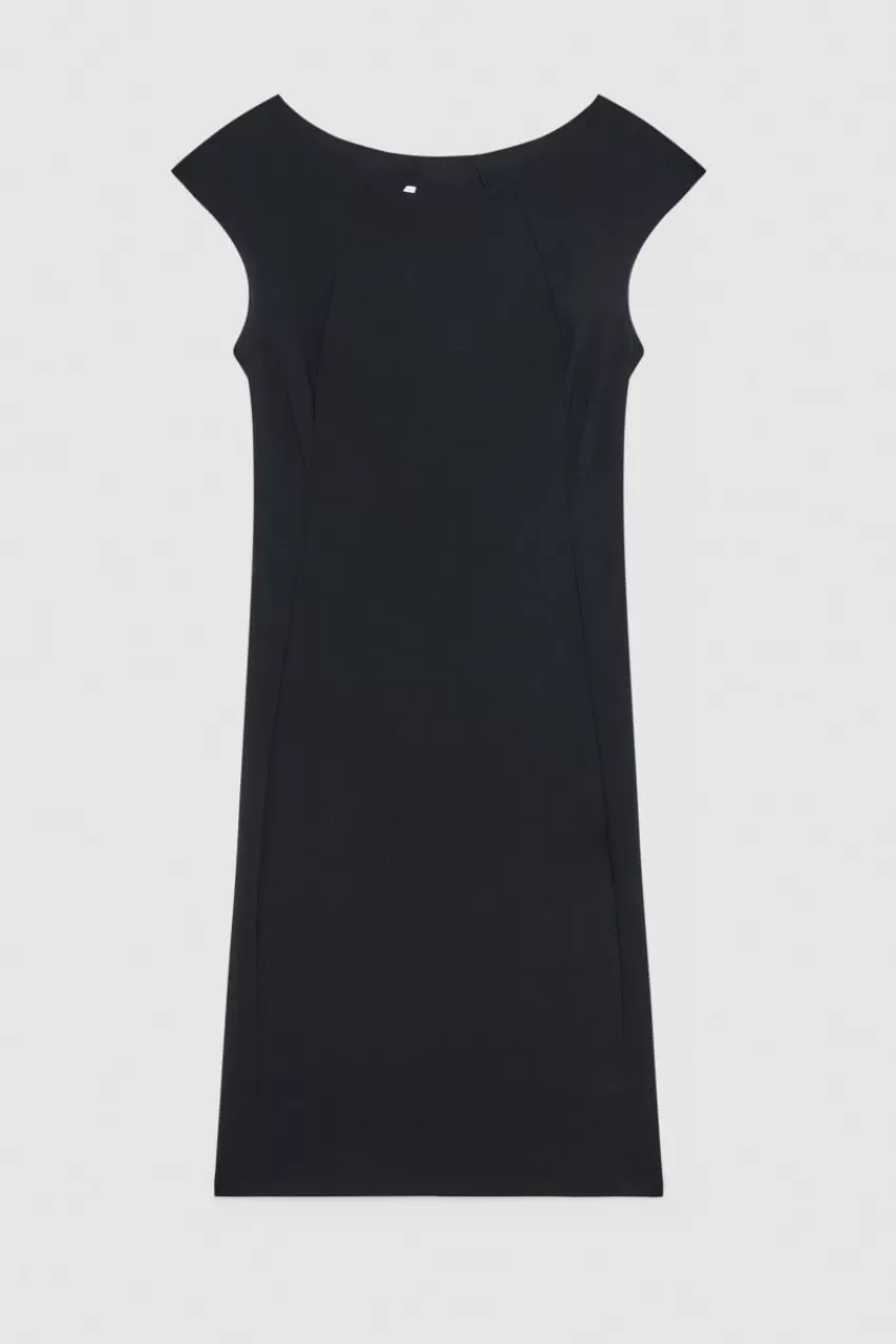 L’abito a tubino attraversa le mode e le stagioni con un fascino intramontabile. Realizzato in jersey tecnico stretch, ha un fit aderente, e scollo a barca. Minimal con un tocco sensuale.
